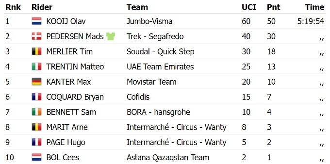 Нидерландский велогонщик команды «Jumbo Visma» Олав Коой стал победителем пятого этапа многодневки Париж – Ницца. В финишном спринте он опередил датчанина Мадса Педерсена из «Trek Segafredo» и бельгийца Тима Мерлира из «Soudal Quick Step».