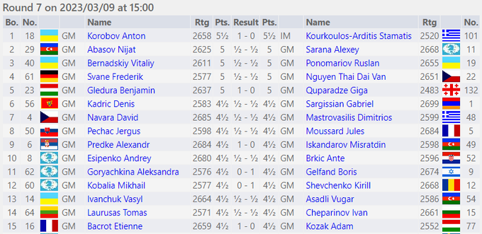 Украинец Антон Коробов победил грека Стаматиса Куркулоса-Ардитиса, набрал 6,5 очков из 7 и удерживает единоличное лидерство. На второй позиции – Бенджамин Гледура из Венгрии (6 очков), именно он будет соперником Коробова 10 марта в 8-м туре.