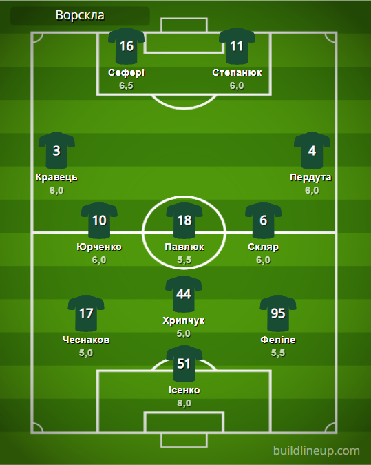 «Ворскла»: Исенко – Чеснаков, Хрипчук, Фелипе (Челядин, 71) – Кравец, Юрченко, Павлюк (Черныш, 71), Скляр (Кане, 71), Пердута – Сефери, Степанюк.