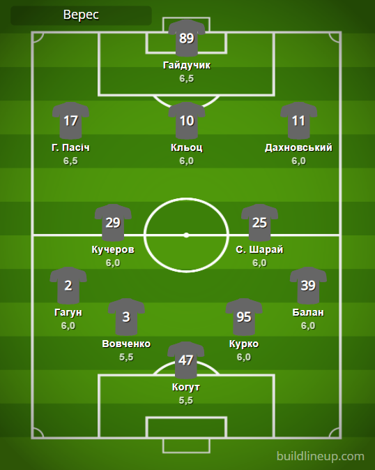 «Верес»: Когут – Гагун, Вовченко, Курко, Балан – Кучеров, С. Шарай (Лебеденко, 74) – Г. Пасич (В. Шарай, 82), Клец, Дахновский (Близниченко, 80) – Гайдучик (М. Шестаков, 75).