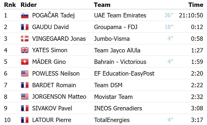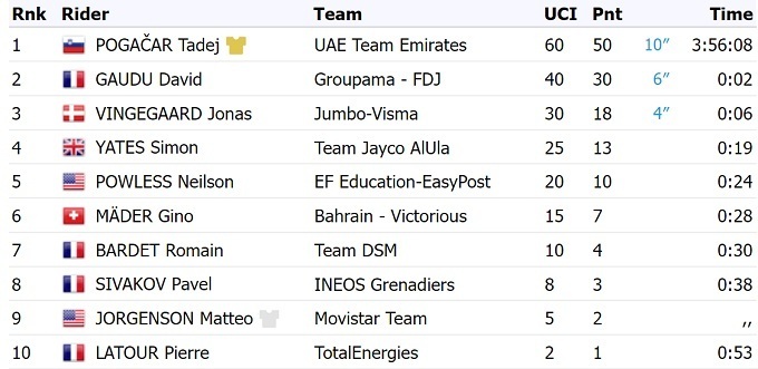 Словенский велогонщик команды «UAE Emirates» Тадей Погачар выиграл седьмой этап многодневки Париж – Ницца с горным финишем Коль де ла Куйоль. Он опередил француза Давида Году из «Groupama FDJ» и датчанина Йонаса Вингегора из «Jumbo Visma».