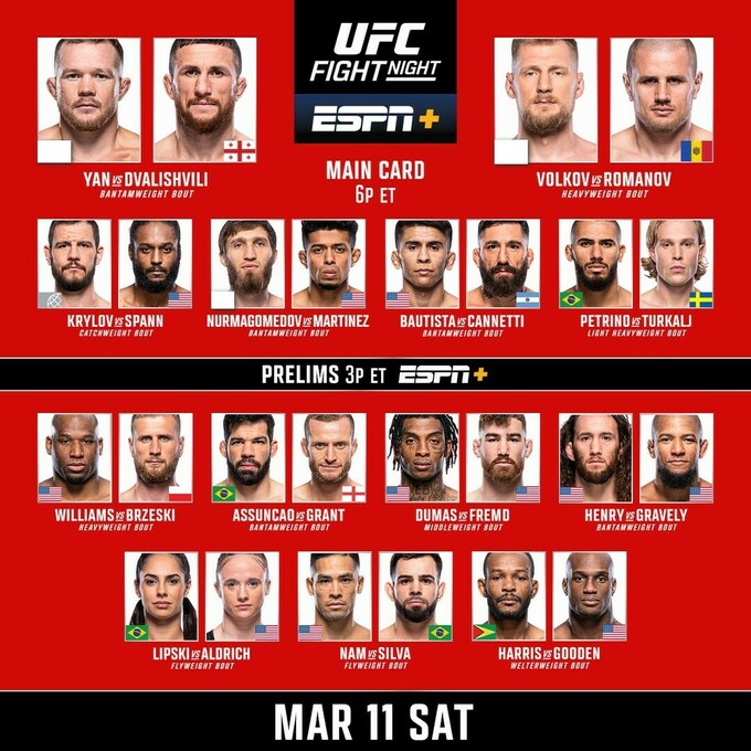 Предварительные бои стартуют в 22:00, основной кард запланирован на 01:00, а главный бой турнира начнется около 03:30 по киевскому времени. В прямом эфире турнир покажут ESPN и UFC TV. Все новости о турнире будут доступны оперативно на Sport.ua.