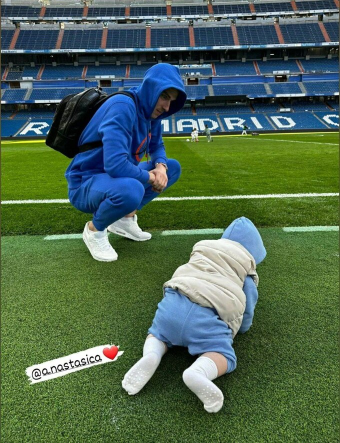 На фотографии, помимо голкипера, запечатлен сын футболиста Андрея на газоне стадиона «Сантьяго Бернабеу». Также фотографией поделилась и жена Андрея Анастасия.
