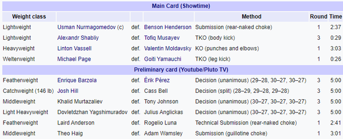 - Усман Нурмагомедов (17–0) – Бенсон Хендерсон (30–12) – SUB 1