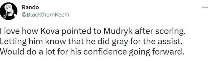 Rando: «Мне нравится, как Кова указал на Мудрика после того, как забил гол. Сообщив ему, что он сделал первый ассист. Сделал бы многое для его уверенности в будущем».
