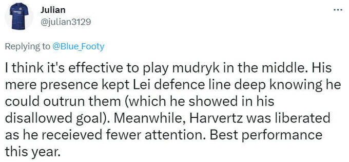 Julian: «Я думаю, эффективно использовать Мудрика в середине. Его присутствие удерживало линию защиты – они знали, что он может обойти их (что он и продемонстрировал своим незасчитанным голом). Тем временем Хаверц был освобожден, поскольку ему уделялось меньше внимания. Лучшее выступление в этом году».