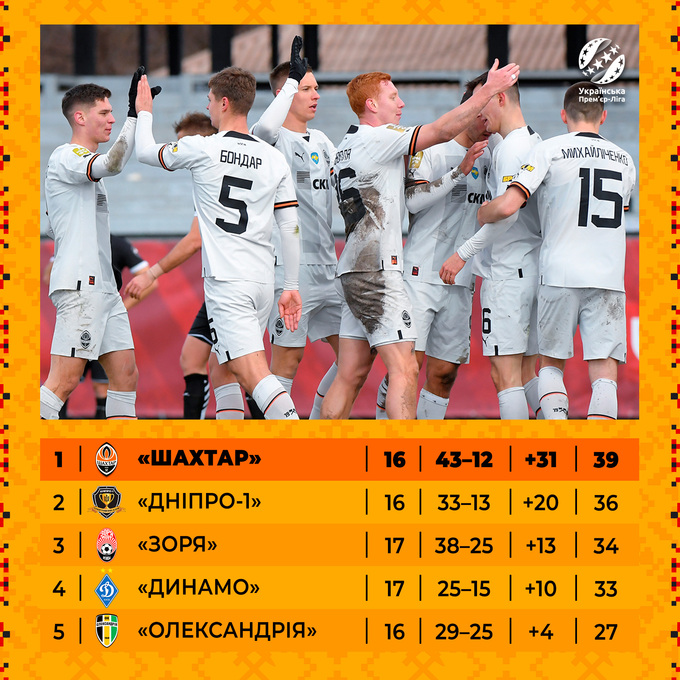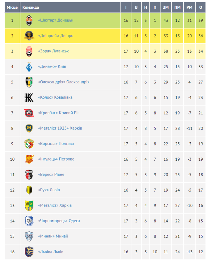 Третье место занимает луганская «Заря» (34), за которой ведет погоню киевское «Динамо» (34 и 33 пунктов соответственно).