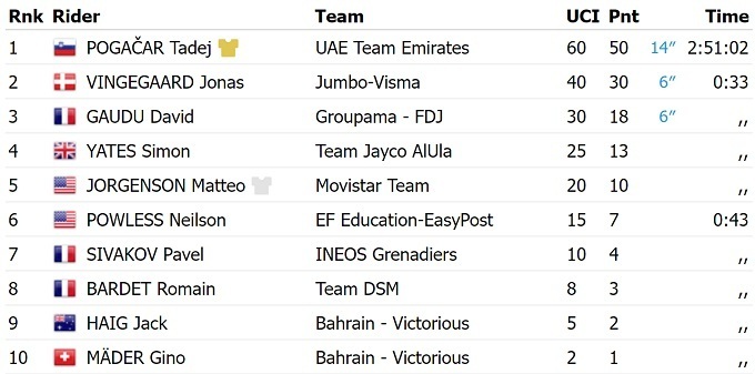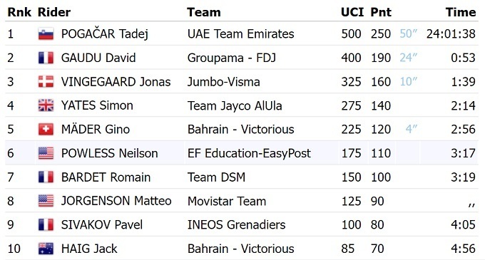 Вместе с Погачаром на подиум общего зачета поднялись француз Давид Году из «Groupama FDJ» и датчанин Йонас Вингегор из «Jumbo Visma».