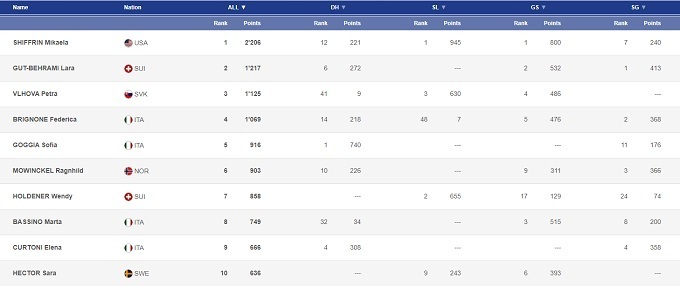 Второй в супергиганте в Сольдеу стала Федерика Бриньоне, которая выдала очень мощный низ, но слишком много проиграла вверху. Но даже в случае победы итальянки при втором месте Гут-Бехрами, кубок она бы не сохранила. Бриньоне также стала четвертой в скоростном спуске, а вот в гиганте сошла в первой попытке вместе с Влховой и Сарой Хектор.