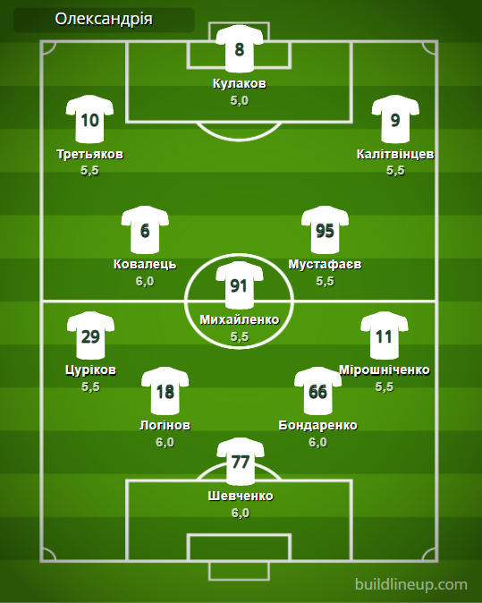 «Александрия»: Шевченко – Цуриков, Логинов, Бондаренко, Мирошниченко – Ковалец (Сигеев, 62), Михайленко (Рыбалка, 63), Мустафаев (Волошин, 74) – Третьяков, Кулаков (Кобзарь, 74), Калитвинцев (Кожушко, 63).