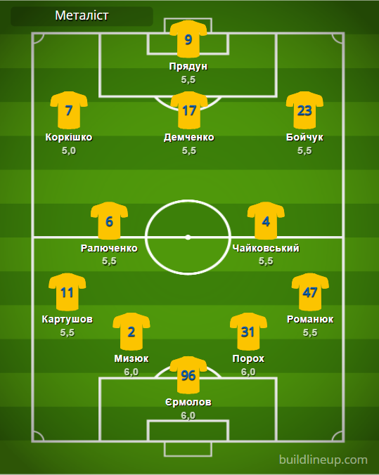 «Металлист»: Ермолов – Картушов, Мизюк, Порох, Романюк – Ралюченко, Чайковский (Панасенко, 63) – Коркишко (Наумец, 46), Демченко (Багачанский, 90+4), Бойчук – Прядун (Рязанцев, 88).