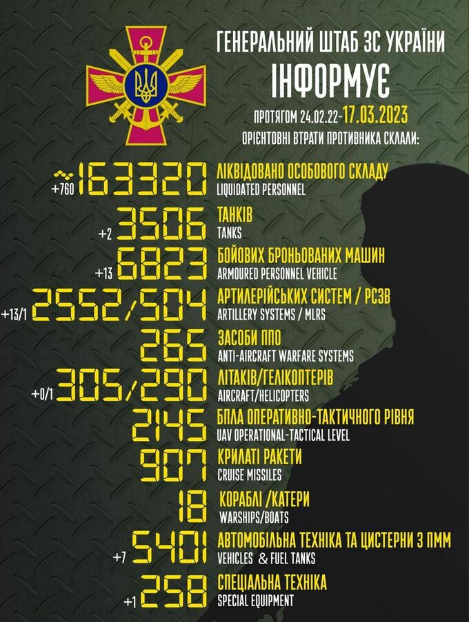 Предлагаем вашему вниманию сводку общих боевых потерь россии с 24.02.2022 по 17.03.2023.