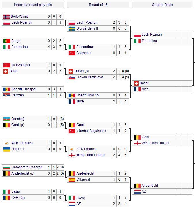 В других парах «Гент» сыграет против «Вест Хэма», АЗ Алкмаар встретится с «Андерлехтом», а «Базель» будет сражаться за путевку в полуфинал с «Ниццей».