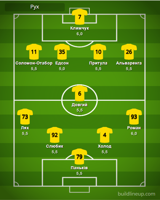«Рух»: Панькив – Лях, Слюбик, Холод, Роман – Довгий – Соломон-Отабор, Эдсон (Таллес, 46), Притула, Альваренга (Рунич, 46) – Климчук.