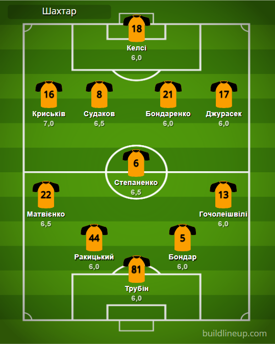 «Шахтер»: Трубин – Матвиенко, Ракицкий (Михайличенко, 69), Бондарь, Гочолеишвили (Конопля, 46) – Степаненко (Назарина, 80) – Крыськив, Судаков, Бондаренко, Джурасек (Очеретько, 66) – Келси (Траоре, 46).