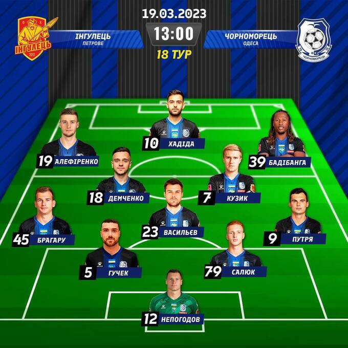 «Черноморец»: Непогодов – Путря, Салюк, Гучек, Брагару, Кузик, Васильев, Демченко, Бадибанга, Алефиренко, Хадида.