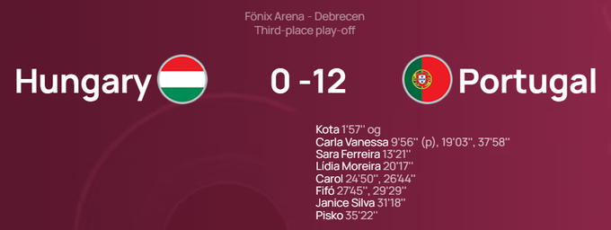 Обладателем третьего места и бронзовых наград стала сборная Португалии, которая разгромила команду Венгрии со счетом 12:0.