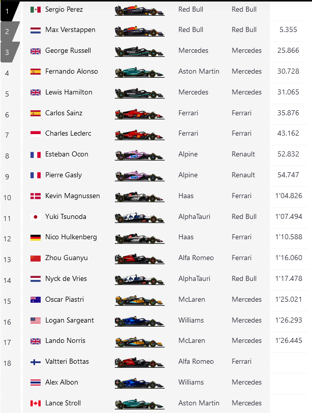Топ-10: Перес, Ферстаппен, Алонсо, Расселл, Хэмилтон, Сайнс, Леклер, Окон, Гасли, Магнуссен