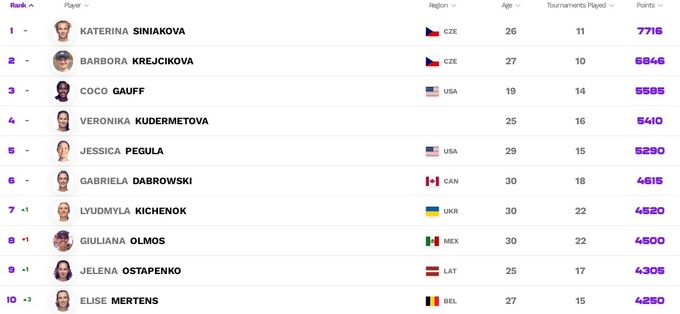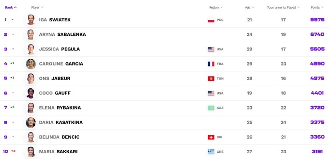 В первой десятке местами поменялись Каролин Гарсия и Онс Жабер, а Мария Саккари опустилась на десятую строчку.