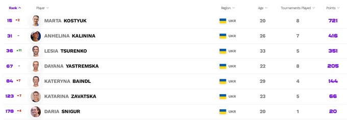 По итогам прошедшего турнира есть чем похвастаться украинским теннисисткам. Наши первый ракетки Ангелина Калинина и Марта Костюк немного обновили личные достижения, а Леся Цуренко поднялась сразу на 14 строчек. Также небольшой прогресс получился у Даяны Ястремской и дарьи Снигур. Катерина Байндл не играет после соревнований в Мериде, из-за чего немного потеряла.