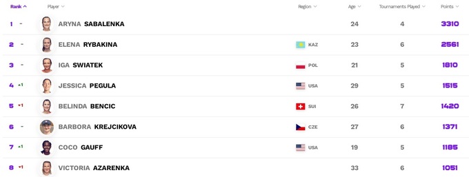 В Чемпионской гонке на 11-е место подтянулась Мария Саккари. В первой восьмерке местами поменялись Джессика Пегула и Белинда Бенчич, а также Кори Гауфф и Виктория Азаренко.