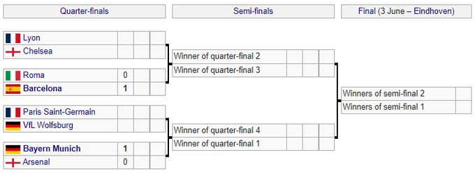 Бавария дома обыграла Арсенал (1:0), а Барселона на выезде победила Рому (1:0). Интересно, что матч в Риме установил рекорд посещаемости для женского футбола в Италии (39454 зрителя).