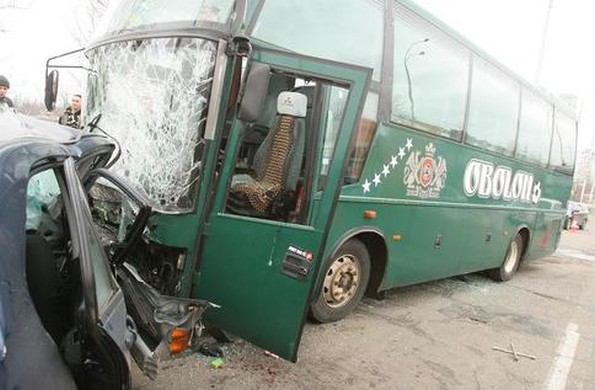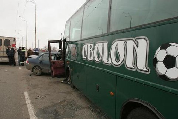 Сегодня днем в Киеве по улице Полярной перед въездом на мост попал в ДТП автобус футбольного клуба «Оболонь», лидера первой лиги. Он столкнулся лоб в лоб с выехавшей на встречную полосу легковушкой Mitsubishi. Водители обоих транспортных средств госпитализированы. «В аварию попал автобус нашей второй команды, с одним водителем. Игроков там не было, — сказал нам исполнительный директор ФК «Оболонь» Алексей Злотоябко. — С водителем все в порядке».