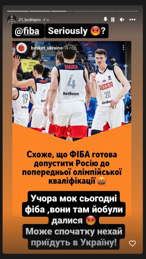 Тимофеенко написал в соцсетях: «Серьезно? Вчера – МОК, сегодня – ФИБА. Они там **** дались? Может, сначала пусть приедут в Украину».