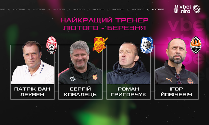 У тренеров на победу также номинированы четверо, а именно – Патрик ван Леувен («Заря»), Сергей Ковалец («Ингулец»), Роман Григорчук («Черноморец») и Игорь Йовичевич («Шахтер»).