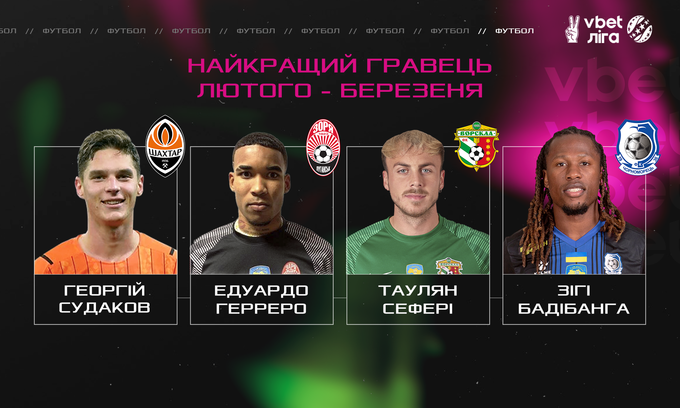 Среди футболистов борьба в голосовании за победу развернется между Георгием Судакова («Шахтер»), Эдуардо Герреро («Заря»), Таулантом Сефери («Ворскла») и Зиги Бадибанга («Черноморец»).