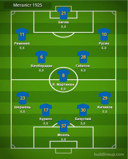 «Металлист 1925»: Мозиль (И. Потомков, 90) – Шершень, Курило, Безуглый, Жичиков – Вачиберадзе (Дмитренко, 58), Я. Мартынюк, Габелок (Игор, 78) – Ременюк (Чирук, 58), Бычек (Кравченко, 90), Русин.