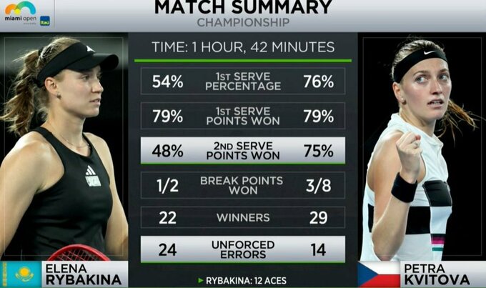 1st Miami Open title 🌴@Petra_Kvitova snaps Rybakina's win streak, 7-6(14), 6-2!#MiamiOpen pic.twitter.com/A5cZ5FUCmm
