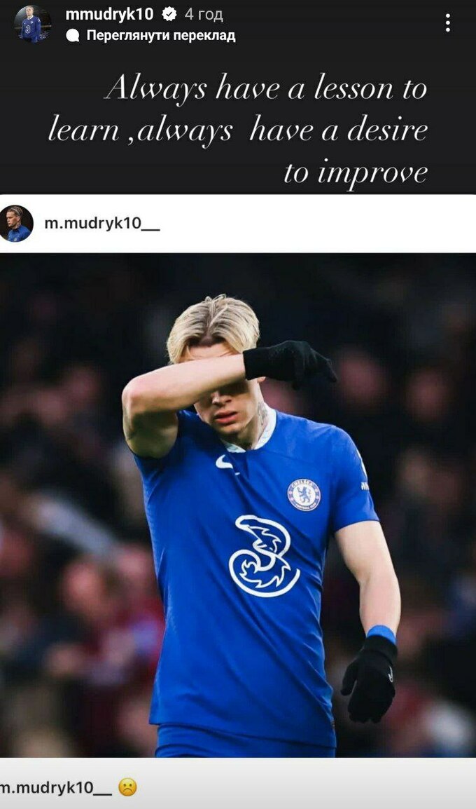 После окончания встречи фан-аккаунт Мудрика в Instagtam сделал публикацию с фото футболиста и подписал ее с помощью грустного эмодзи. Мудрик зарепостил к себе в сториз и подписал: