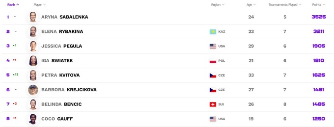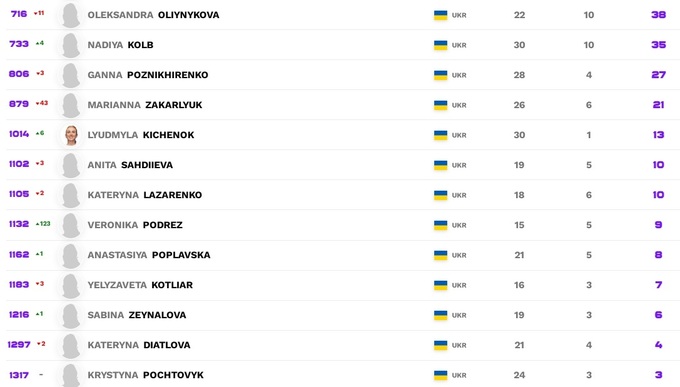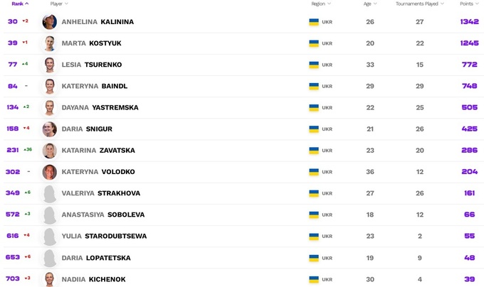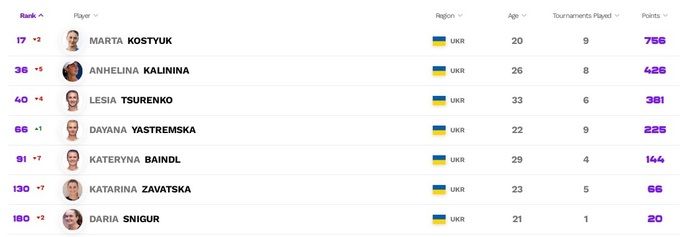 Что касается украинок, то Ангелина Калинина, Марта Костюк и Дарья Снигур немного потеряли. На четыре строчки поднялась Леся Цуренко, на две – Даяна Ястремская, солидно добавила Катарина Завацкая.