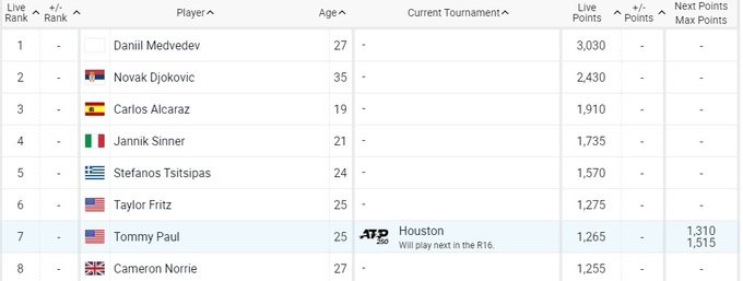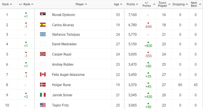 Финалист турнира в Майами итальянец Янник Синнер повторил лучшее достижение в карьере, вернувшись на девятую строчку мировой классификации. Также в первой десятке произошло несколько небольших изменений.