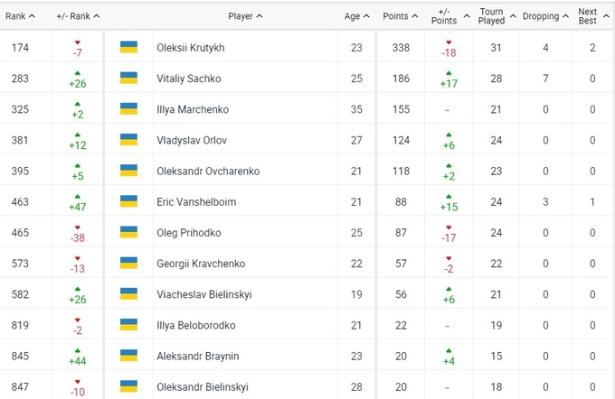 Что касается украинцев, то наш лидер Алексей Крутых потерял семь позиций. Зато многие за две недели хорошо понабирали очков. Виталий Сачко вернулся в третью сотню, Эрик Ваншельбойм улучшил свое положение на 47 позиций. Также в плюсе остались Илья Марченко, Владислав Орлов, Александр Овчаренко, Вячеслав Белинский и Александр Брайнин.