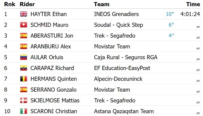 Британский велогонщик команды «Ineos Grenadiers» Итан Хейтер выиграл первый этап престижной многодневки Мирового тура Тур Страны Басков. В финишном спринте он опередил швейцарца Мауро Шмида из «Soudal Quick Step» и испанца Йона Аберастури из «Trek Segafredo».