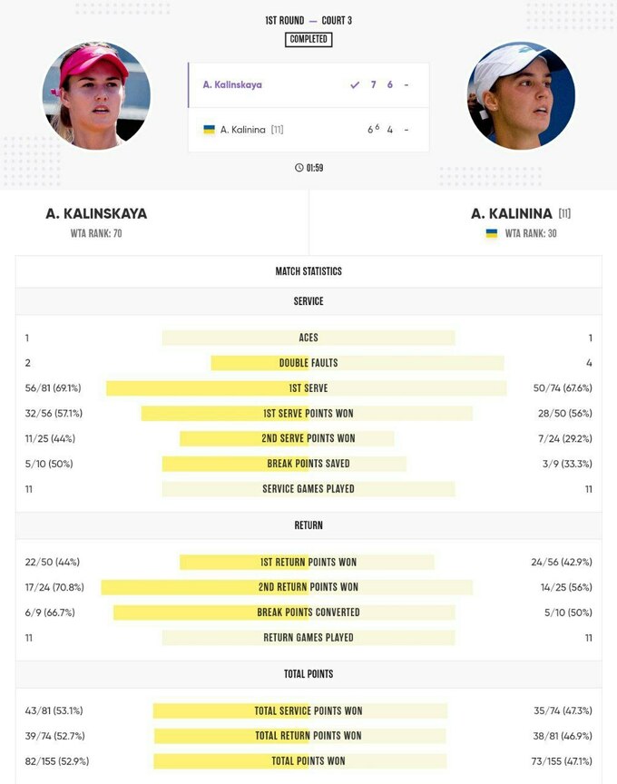 Второй сет начался с того, что Калинина проиграла гейм на своей подаче и так и не смогла вернуться в игру, проиграв вторую партию.