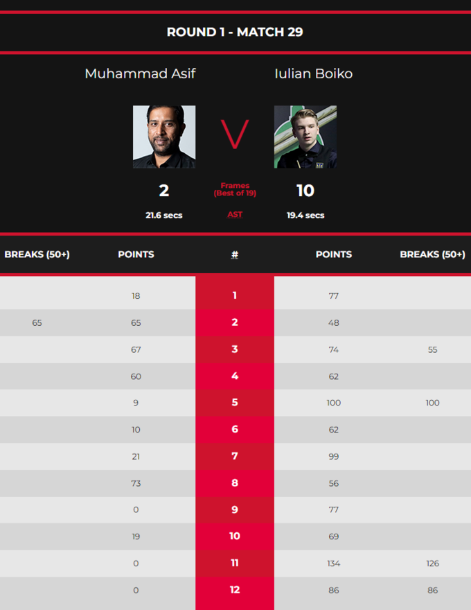 Его соперником в 1-м раунде был Мухаммад Асиф из Пакистана, двукратный чемпион мира среди аматоров (2012, 2019). Бойко уверенно разгромил соперника со счетом 10:2. Юлиан даже исполнил два сенчури-брейка (100+ очков за один подход)