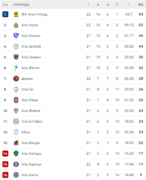 «Аль-Наср» занимает второе место, отставая от «Аль-Иттихада» на одно очко