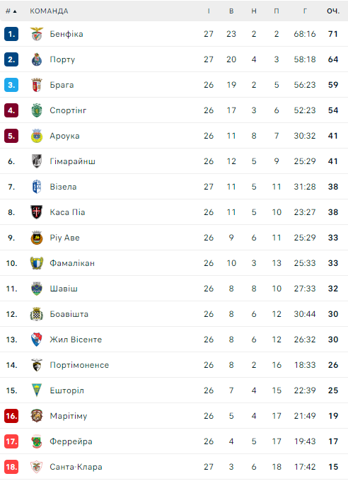 Топ-4: Бенфика (71 очко), Порту (64), Брага (59), Спортинг (54).