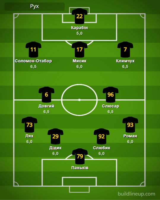 «Рух»: Панькив – Лях, Дидык, Слюбик, Роман – Довгий, Слюсар (Притула, 68) – Соломон-Отабор, Мисик (Эдсон, 58), Климчук – Карабин (Рунич, 46).