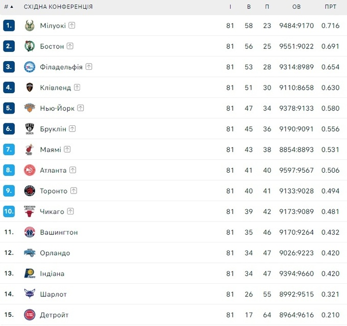 В Восточной конференции Национальной баскетбольной ассоциации за один тур до конца регулярного сезона стали известны все пары не только плей-ин, о чем ранее уже сообщалось, а и плей-офф. Несмотря ни на что, позиции клубов на первых 10 местах в таблице уже не изменятся.