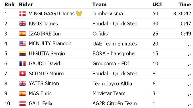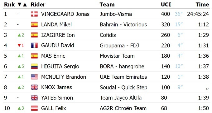 Компанию на итоговом подиуме общего зачета Вингегору составили два местных гонщика – Микель Ланда из «Bahrain Victorious» и Йон Исагирре из «Cofidis».