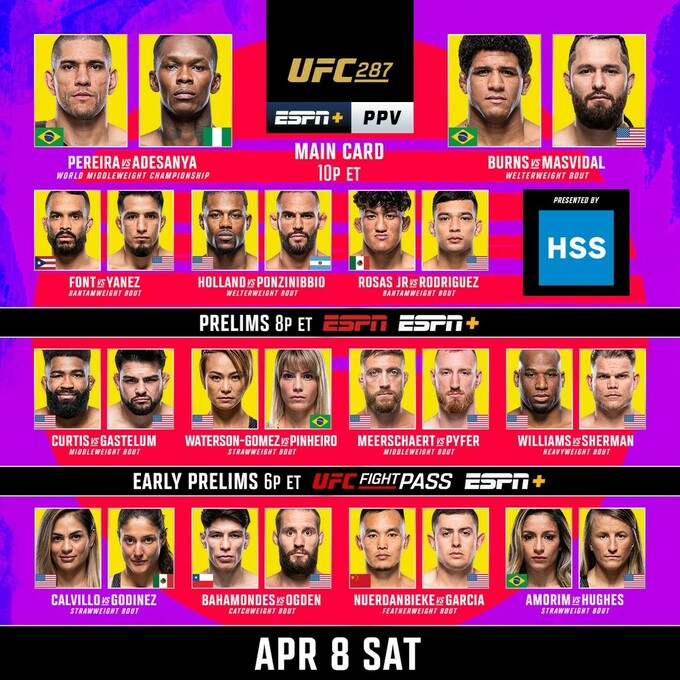 - Алекс Перейра (7–1) – Исраэль Адесанья (23–2)