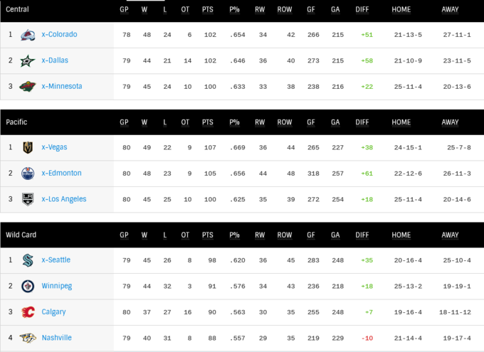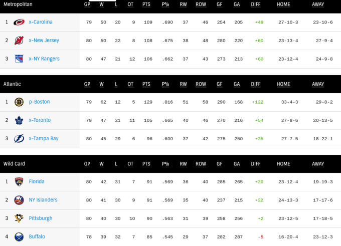Флорида и Айлендерс имеют по 91 пункту, занимая обе wild card позиции, а у Пингвинов на один пункт меньше. Всем осталось провести в регулярном сезоне по два матча. На Западе в похожей ситуации Виннипег и Калгари. Сегодня Джетс победили, а вот Огни проиграли по буллитам и отстают от конкурента на одно очко.