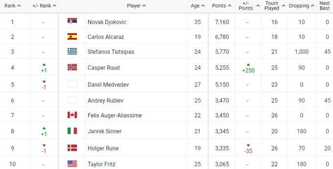 В первой десятке состоялось еще одно изменение – Янник Синнер опередил Хольгера Руне.