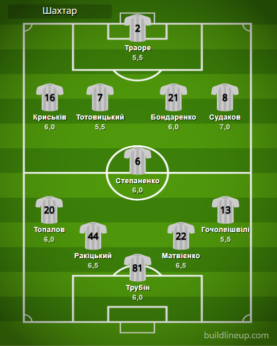 «Шахтер»: Трубин – Топалов, Ракицкий, Матвиенко, Гочолеишвили – Степаненко – Крыськив (Очеретько, 27, Келси, 71), Тотовицкий (Борячук, 83), Бондаренко, Судаков – Траоре (Сикан, 82).