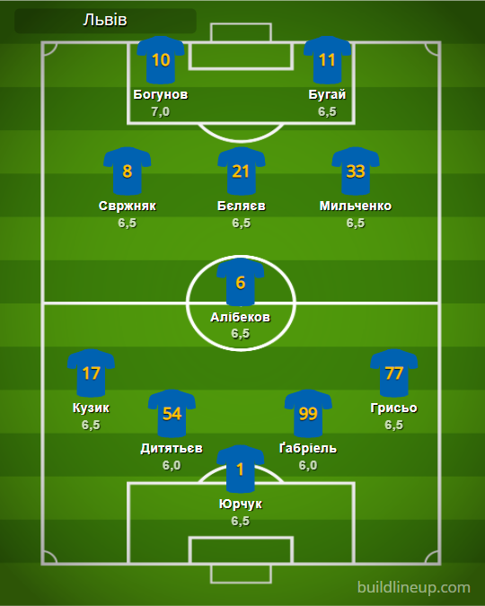 «Львов»: Юрчук – Кузык, Дитятьев, Габриэль, Грисьо – Алибеков (Никитюк, 84) – Свржняк (Мышенко, 67), Беляев, Мильченко – Богунов, Бугай (Сасовский, 78).