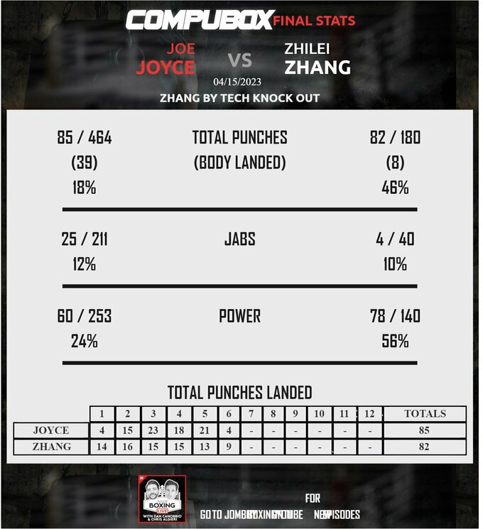 Zhang's power & accuracy was evident from the opening bell, as he landed 56% of his power punches, closing the right eye of the stationary Joyce, who landed just 18% of his 464 thrown punches. pic.twitter.com/Qwwsd0ijA8